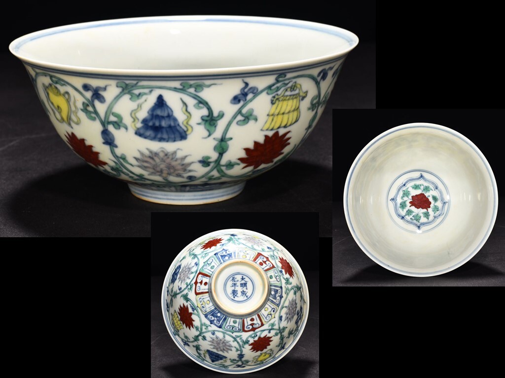 - ■TB434■大明成化年制銘 闘彩 八寶紋宮式碗 時代物 古玩 唐物 古陶磁器■
