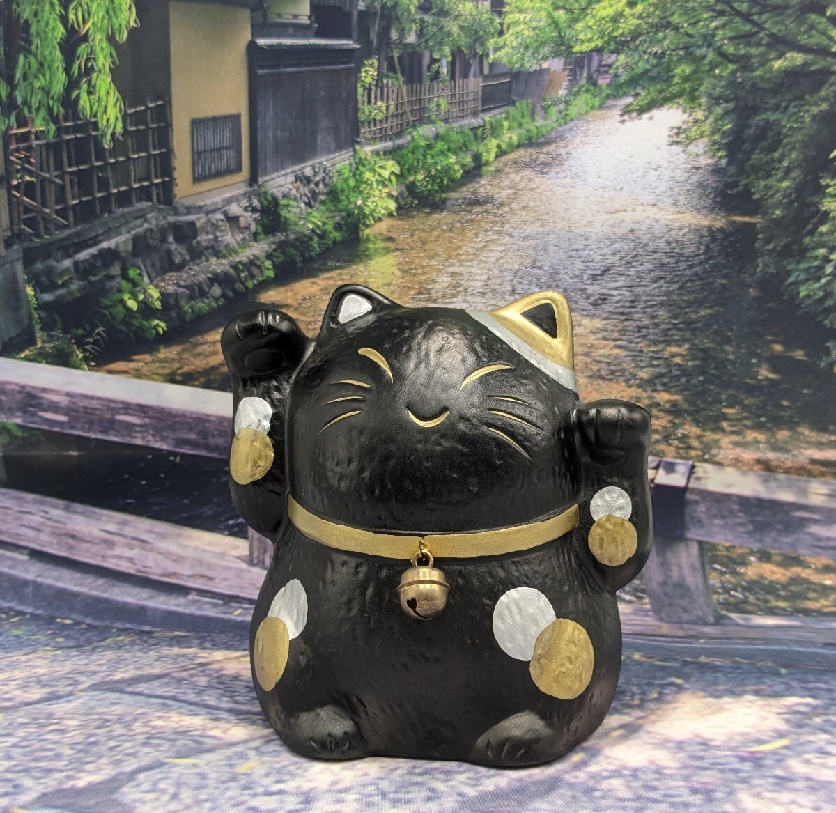 - 縁起物 招き猫 両手あげ 黒猫 鈴付き
