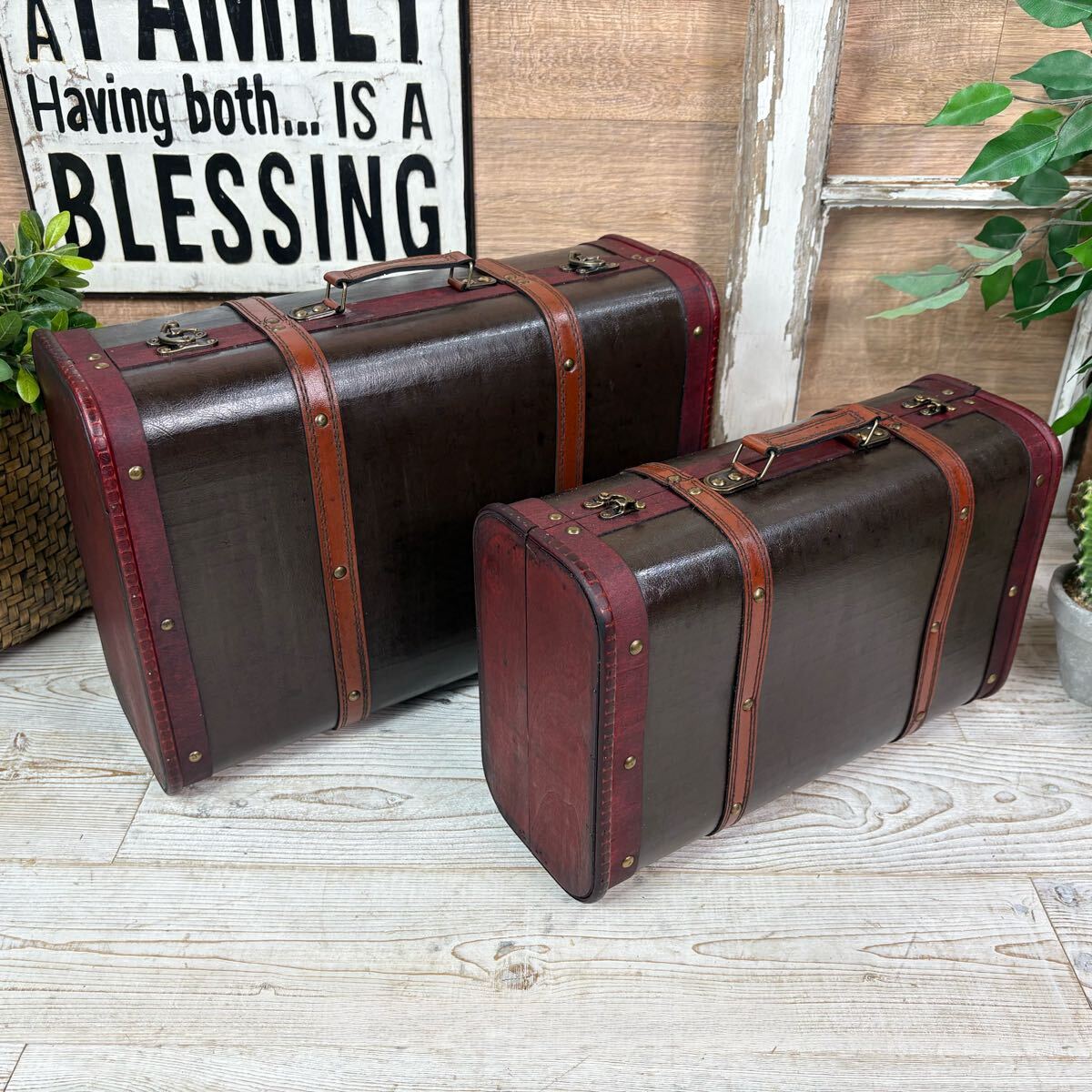 - アンティークビンテージ調トランク型木製ケース大小2点セット小物入れボックス木箱宝箱収納BOX