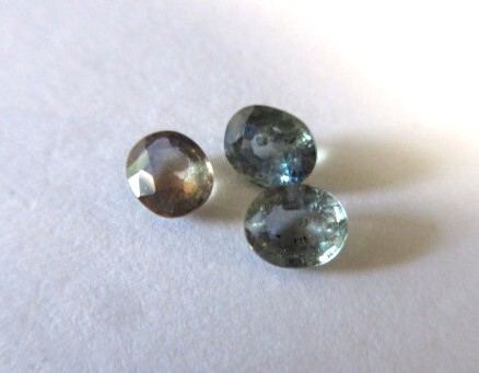 グリーン系、ブラウン系のサファイア3点です。インクルージョンがありますが、透明感とテリがあります。非加熱。