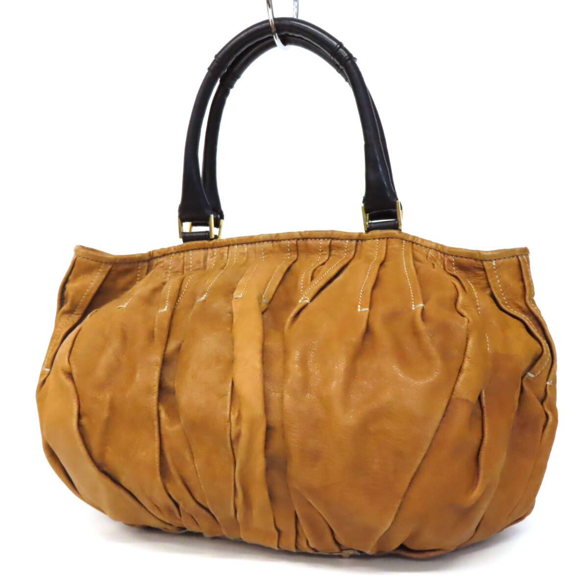 - WG25112 美品 ARISTOLASIA アリストラジア トートバッグ ギャザー タック 牛革 レザー ステッチ G金具 底鋲 大きめ キャメル 茶×黒 伊製