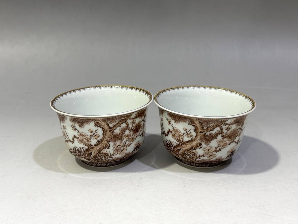 > 7+GV5566「東洋美術」骨董 人間国宝 磁器製品【明礬赤と金で描かれた花と詩が描かれたカップのペア】旧物 孤品 珍品 陶磁器 収蔵価値が高い