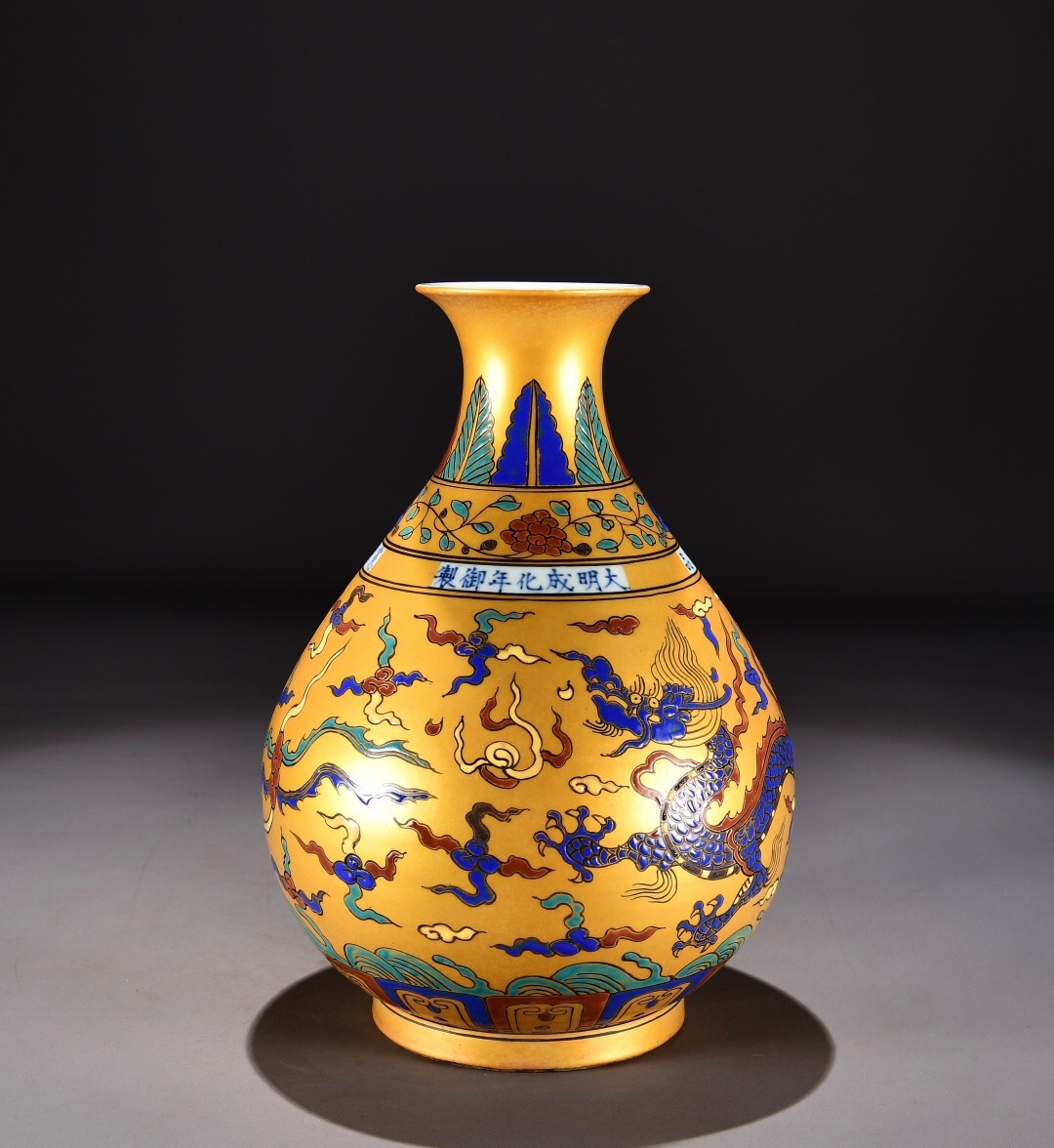 > 蔵友旧蔵出 明 成化年製款 金地 五彩 龍鳳紋 玉壺春瓶 稀少珍品 貴重品 古陶瓷品 置物 古賞物 中国古玩 中国古美術品