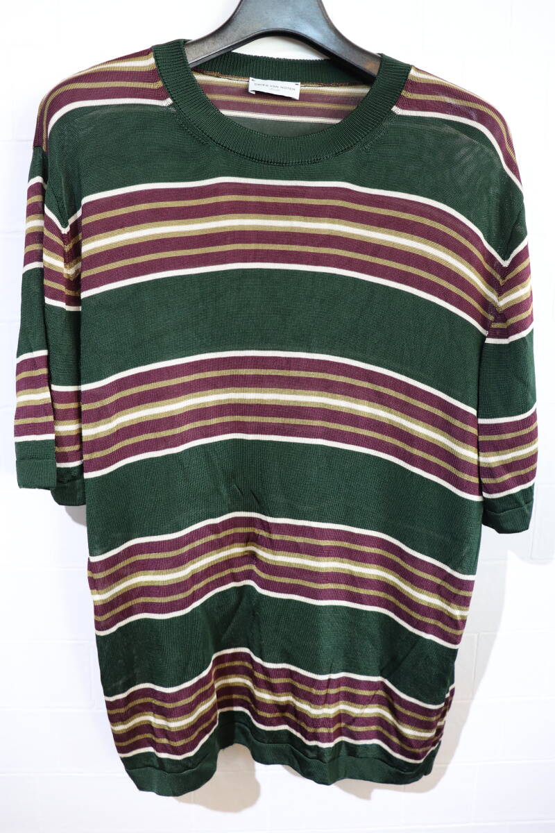 > 即決 DRIES VAN NOTEN ドリスヴァンノッテン ベルギー製 上質ヴィスコース素材 美配色マルチボーダー柄 半袖サマーニットシャツ メンズS 緑
