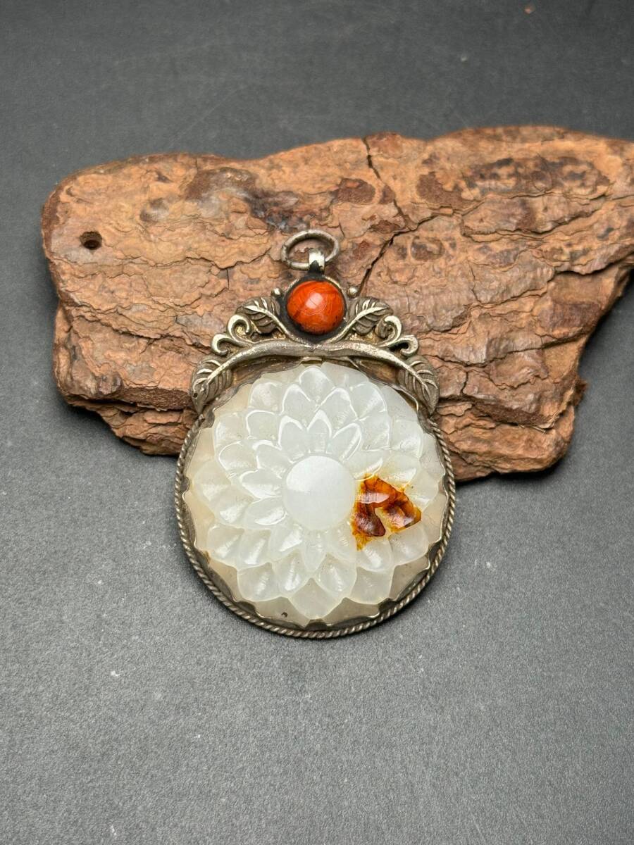 - 蔵友旧蔵出 和田玉製 細密彫 銀嵌 帽花 希少珍品 貴重品 置物 古賞物 中国古玩 中国古美術品