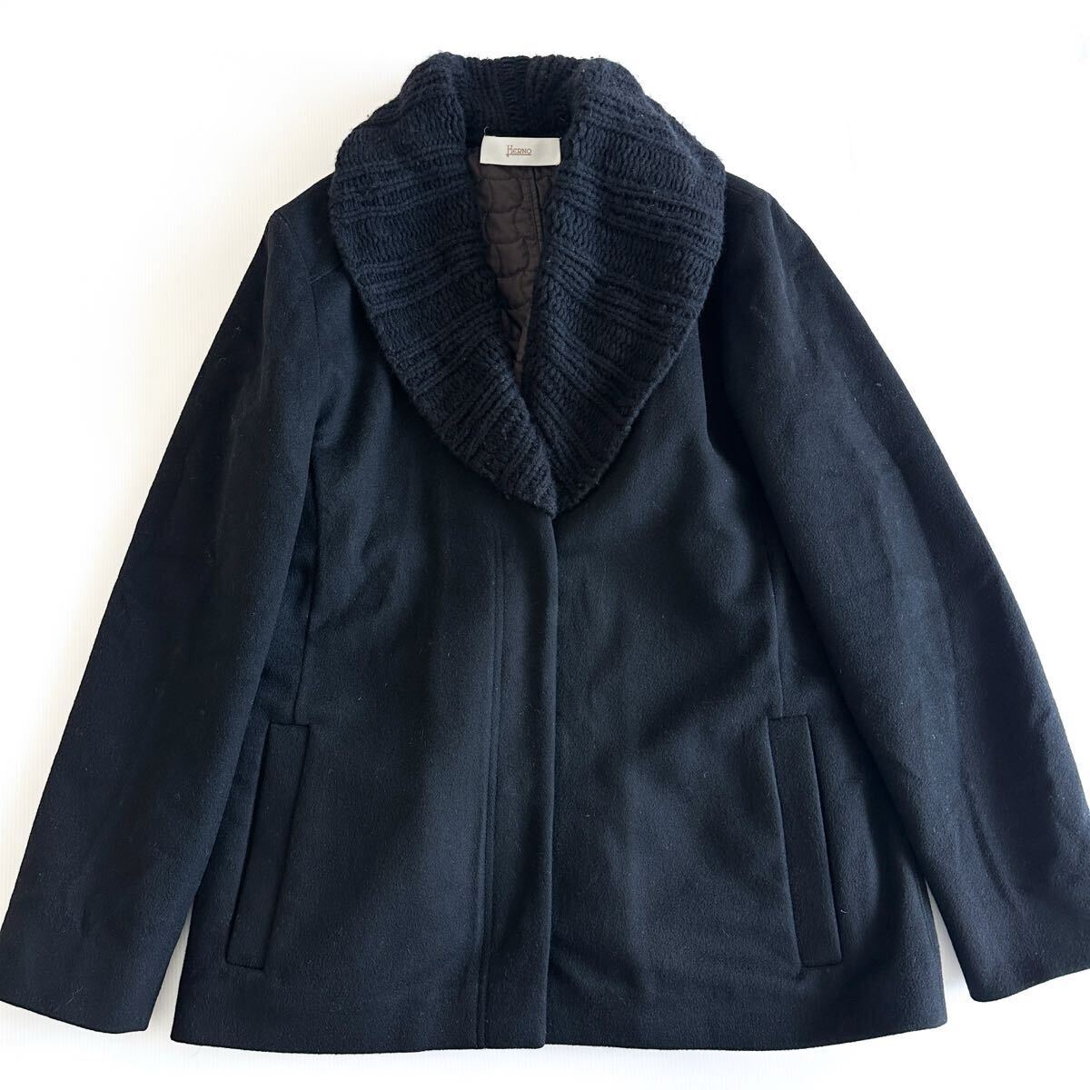 - ★ HERNO ヘルノ / ニット襟 ショール コート 黒 42 キルティング裏地 イタリア製 ショート ブラック Lサイズ