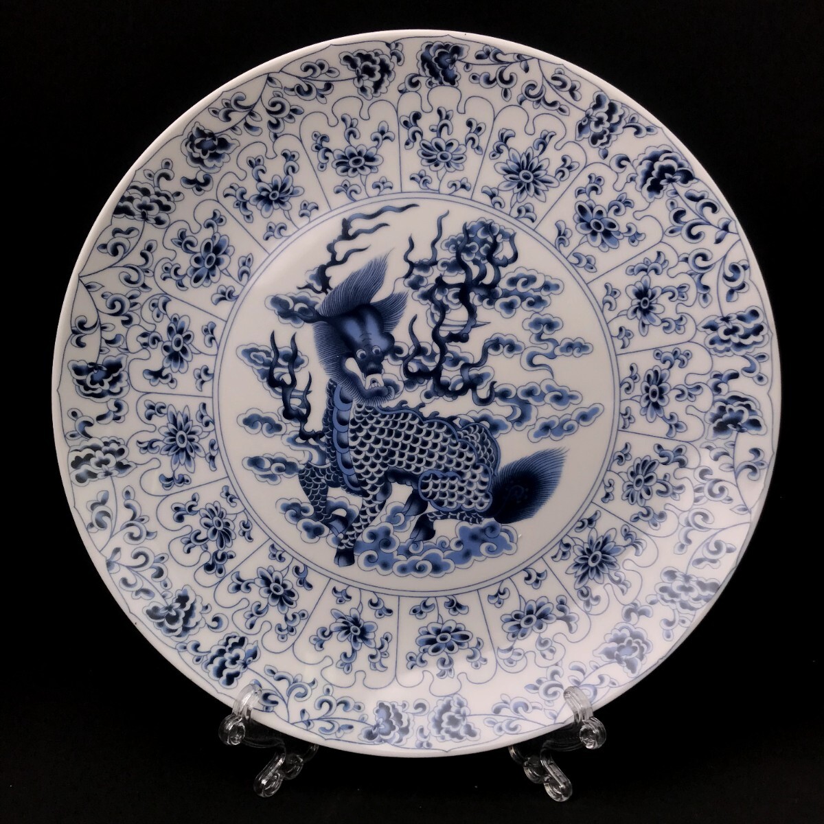 - 中国美術 青花 飾り皿 神獣盤 飾皿 大皿 大清乾隆年製款 飾皿 置物 陶磁器 観賞皿