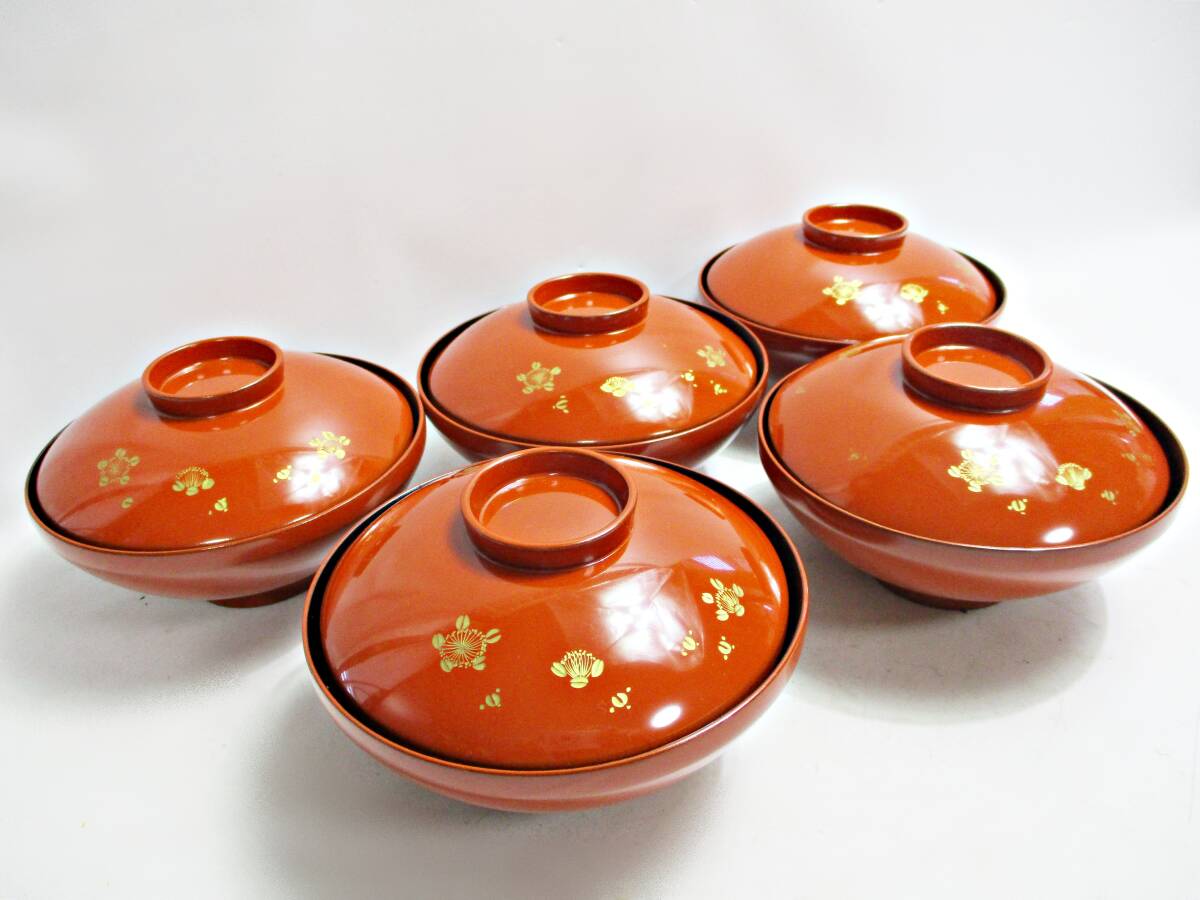 - 《ジャムルK》 khc0729-121◆◆ 輪島塗 元岡光漆堂謹製 塗師 清斉 沈金師 満斉 朱塗 吸物椀 五客 天然木 共箱 未使用 長期保管