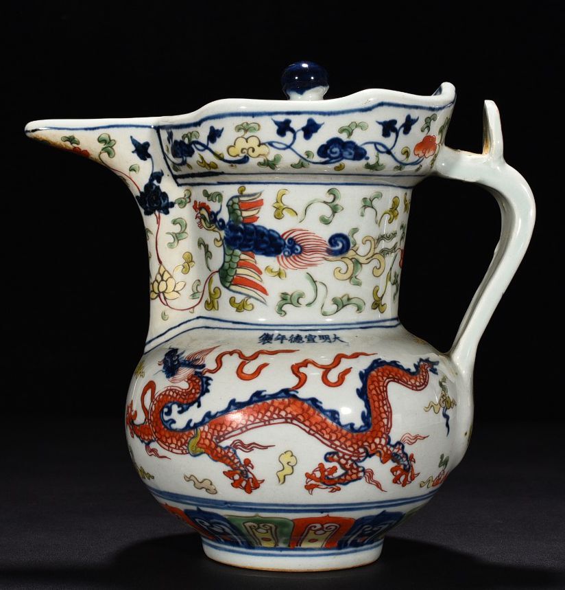 - BD170■大明宣徳年制款 青花五彩龍鳳凰紋水注 時代物 古玩 唐物 古陶磁器■