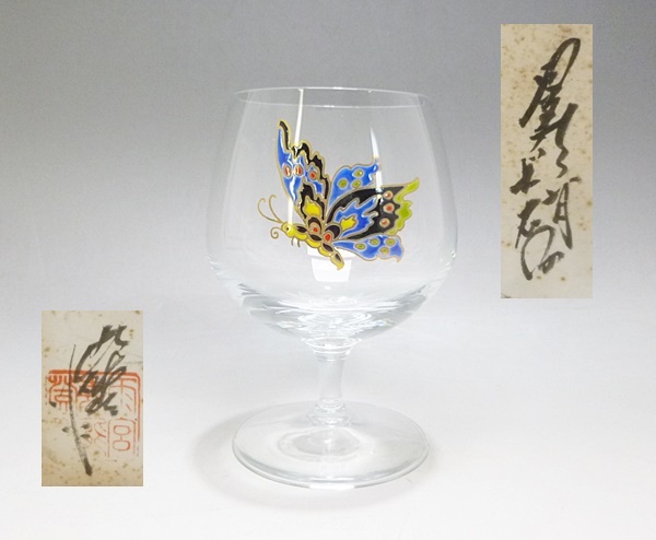 - 《ジャムルK》◆kks0730-139◆雨宮喜能登 窯彩硝子 ブランデー ワイングラス 蝶図 クリスタル 約176g 酒器 工芸ガラス 作家物