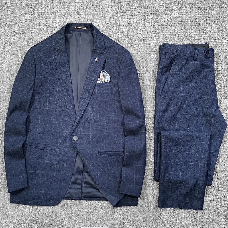 - 新作推薦 メンズ スーツセット ウール混 ビジネスフォーマル チェック柄 春秋 スーツ上下セット 長ズボン /紺色