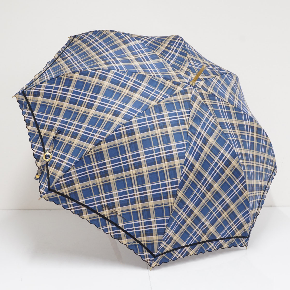 - 傘 Ralph Lauren ラルフローレン USED美品 レディース チェック ブルー ロゴ スカラップ刺繍 竹手元 60cm S3017