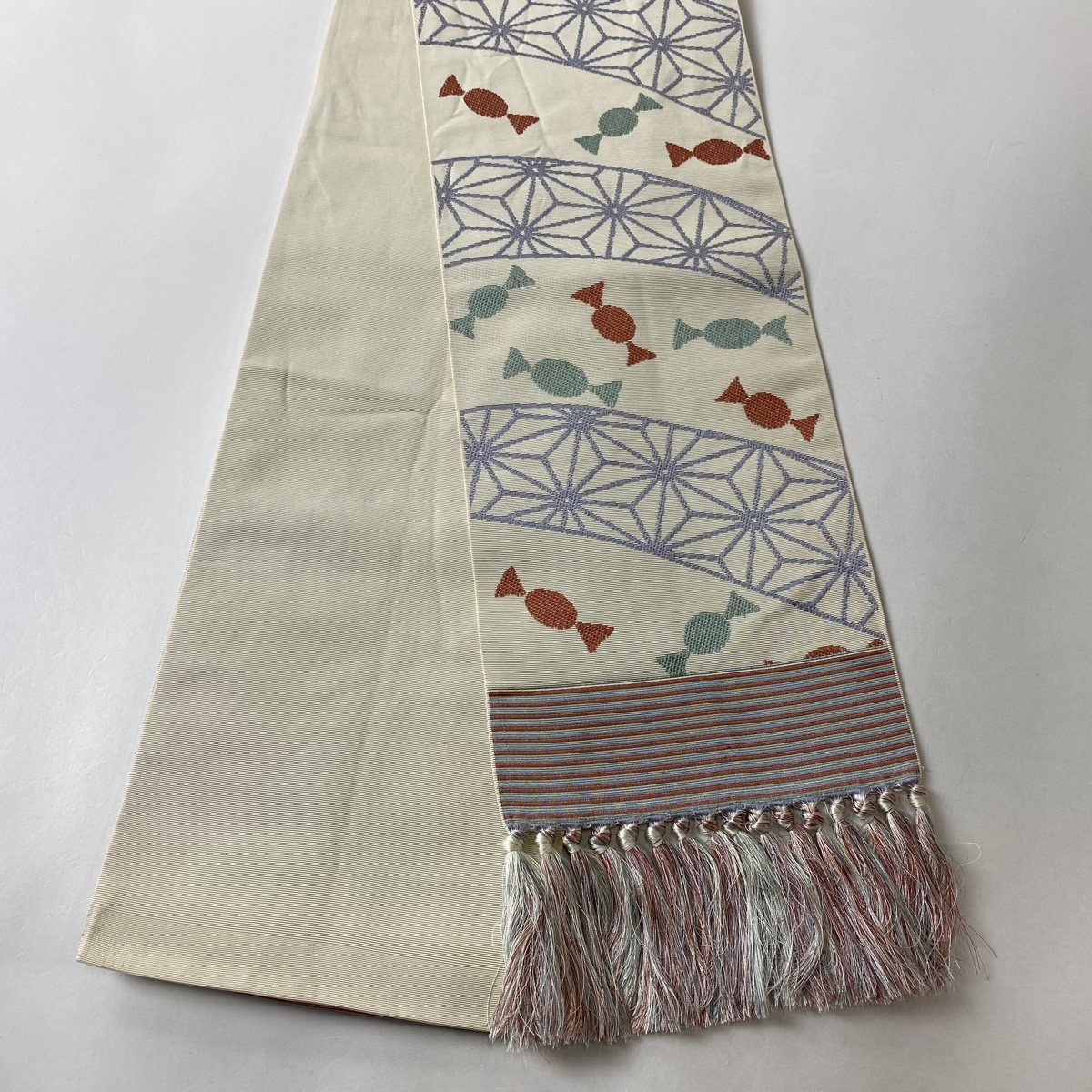 - 半幅帯 名品 証紙 博多織 麻の葉 飴 クリーム 正絹 【中古】
