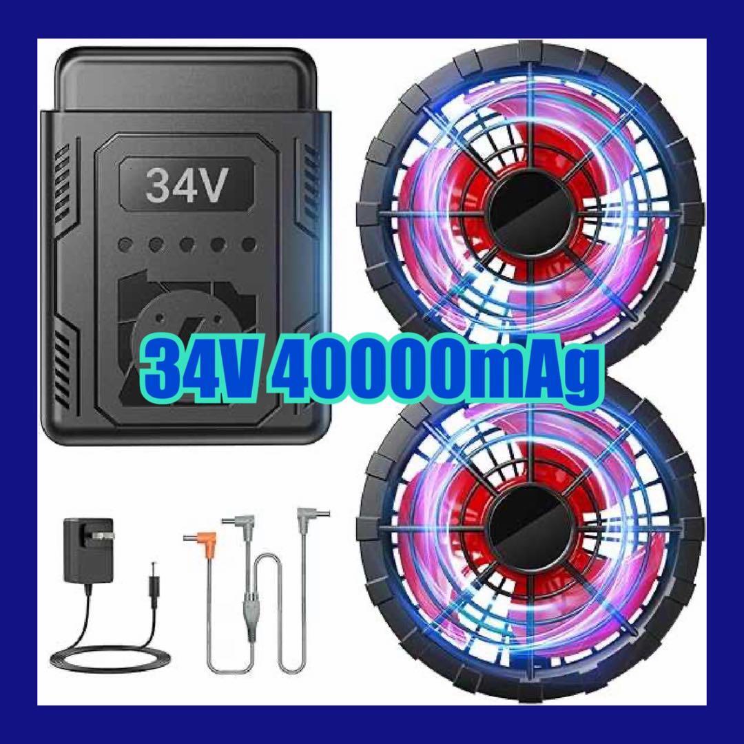> 34V 超高出力 40000mAh大容量 ファンバッテリーセット ファン付き 作業服対応 空調作業服 バッテリー 急速充電 PSE認証済