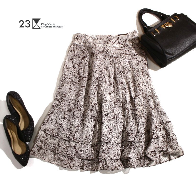 > 美品 23区 株) オンワード樫山 春 夏 オーガンジー レース フラワー プリント 柄 上品 フレアスカート 9号 38 ダークブラウン ホワイト 白