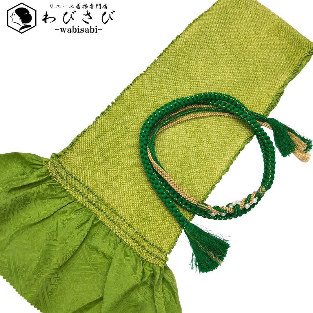 緑色ベースの総絞りの帯揚げに金糸が使用された飾り付の帯締めが素敵なお品でございます。