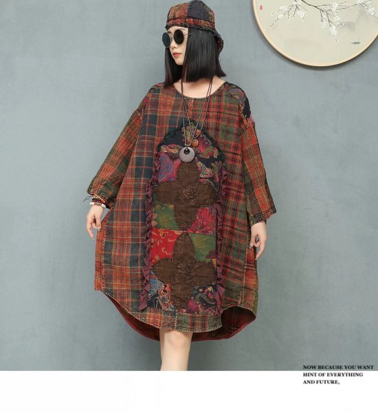 - gl 2508 ロングチュニック トップス 綿&麻 洋服ミックス アンティーク風 ロマンファッション バッチ チェック柄 貼り付け花柄バッチ