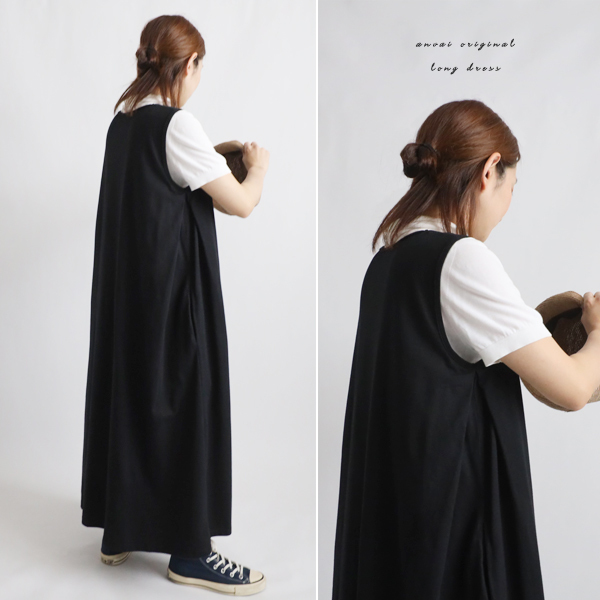 - 最終SALE 120cm 度詰め天竺コットンTシャツ生地 脇下タック入ロング ワンピース 黒 R62