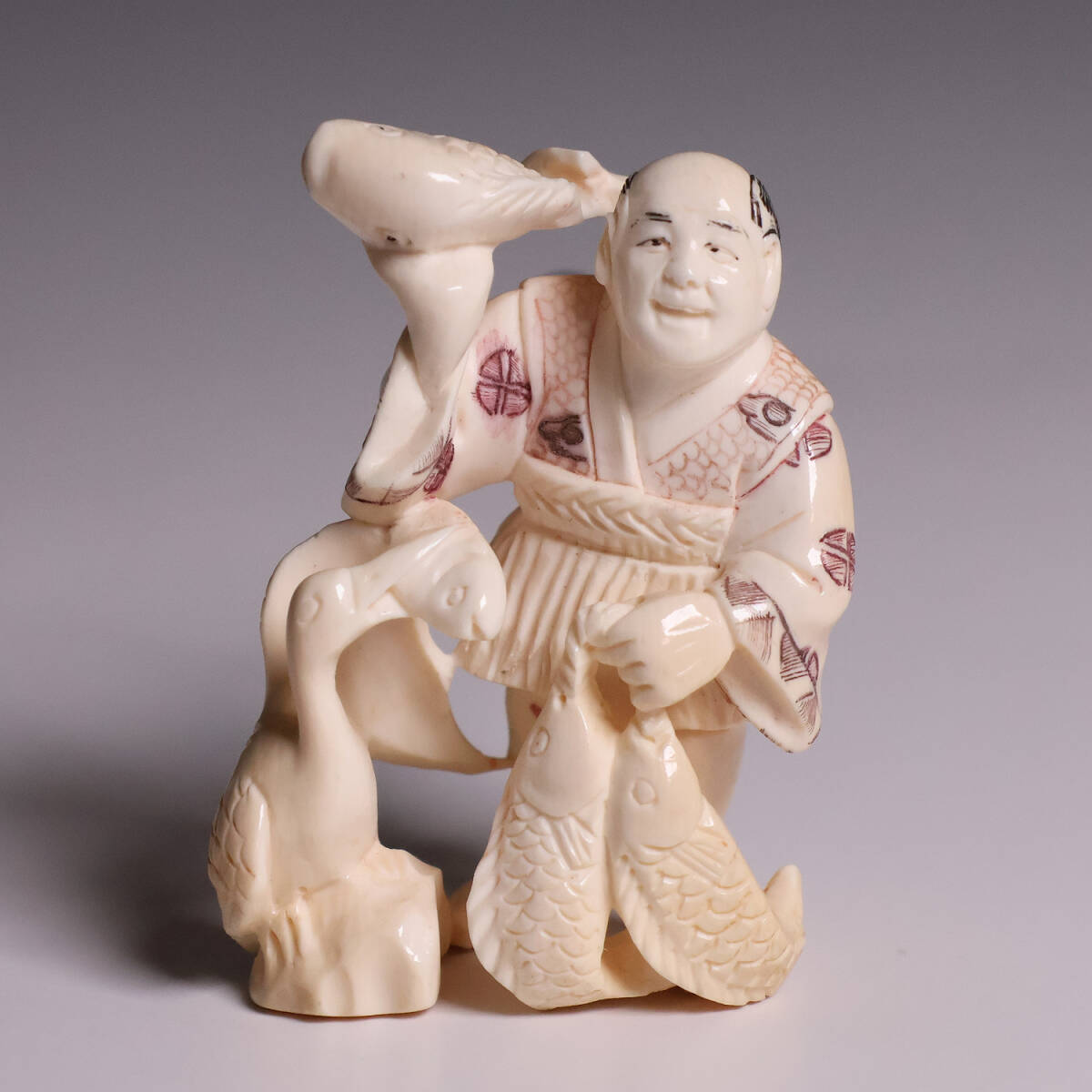 - 時代 堤物 根付 天然素材 漁夫 人物 在銘 牙彫 白材 鯛 魚 鳥 彫刻 提げ物【CM268】