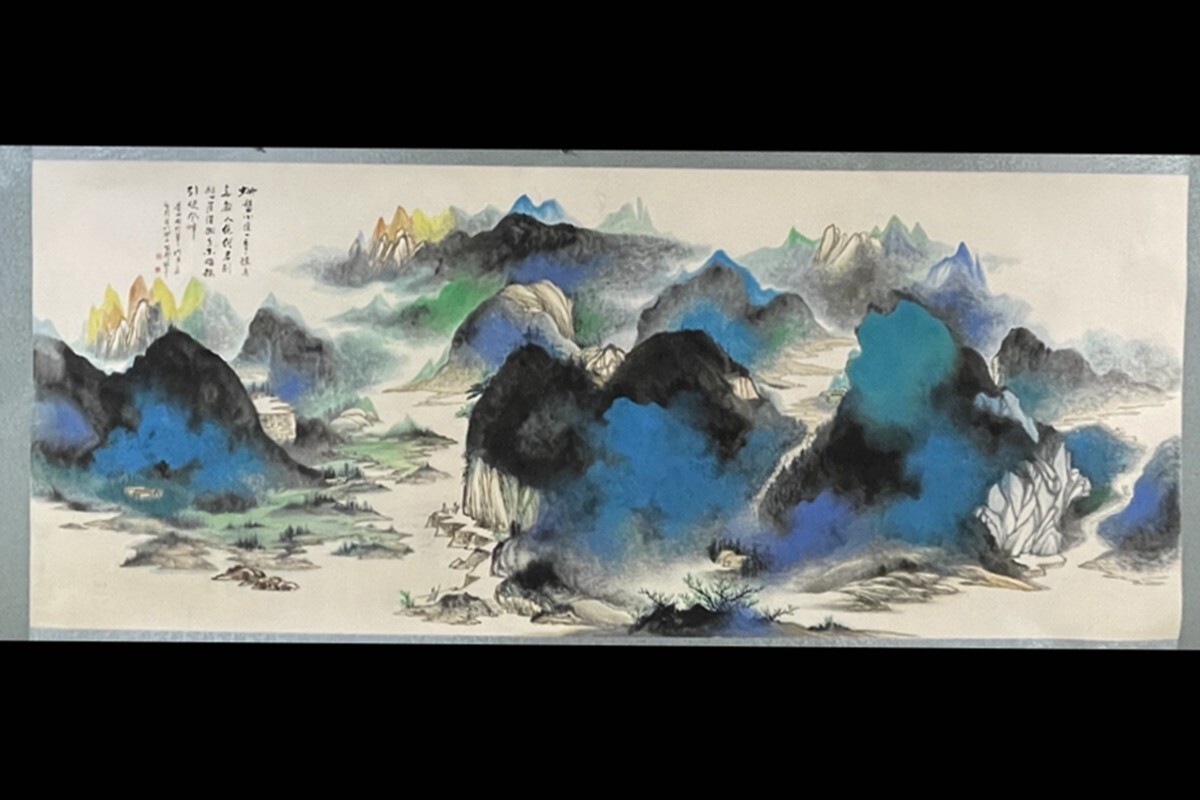 - 中国書画「張大千 溌彩山水図 鏡片」肉筆紙本 掛け軸 墨寶妙品 書画横軸 巻き物 古美術 旧蔵出