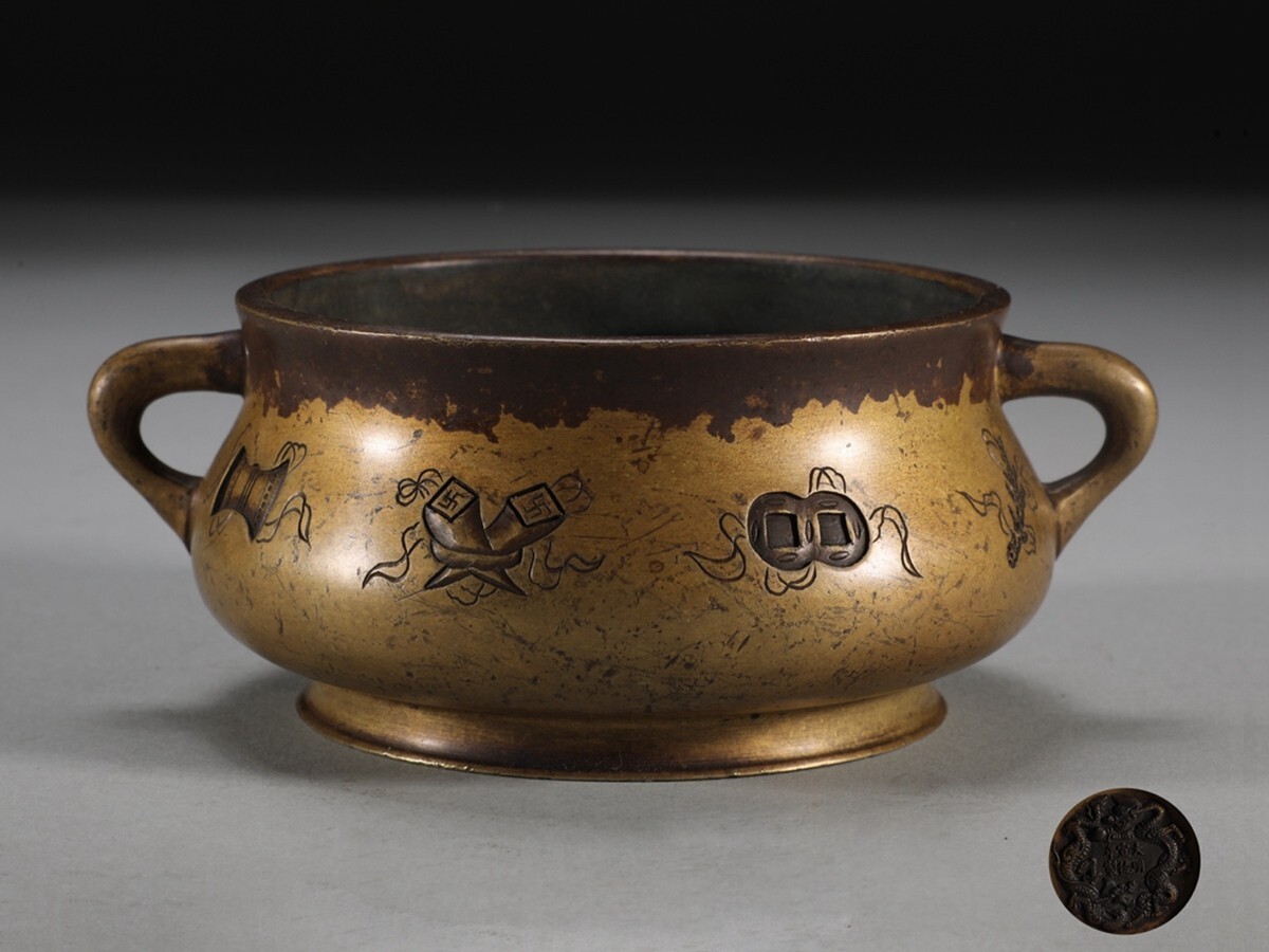 - 「明代 双龍抱 大明宣徳年製 古銅彫 雜寶紋 蚰龍耳老銅香炉」旧銅器 置物擺件 賞物 中国古美術 旧蔵出