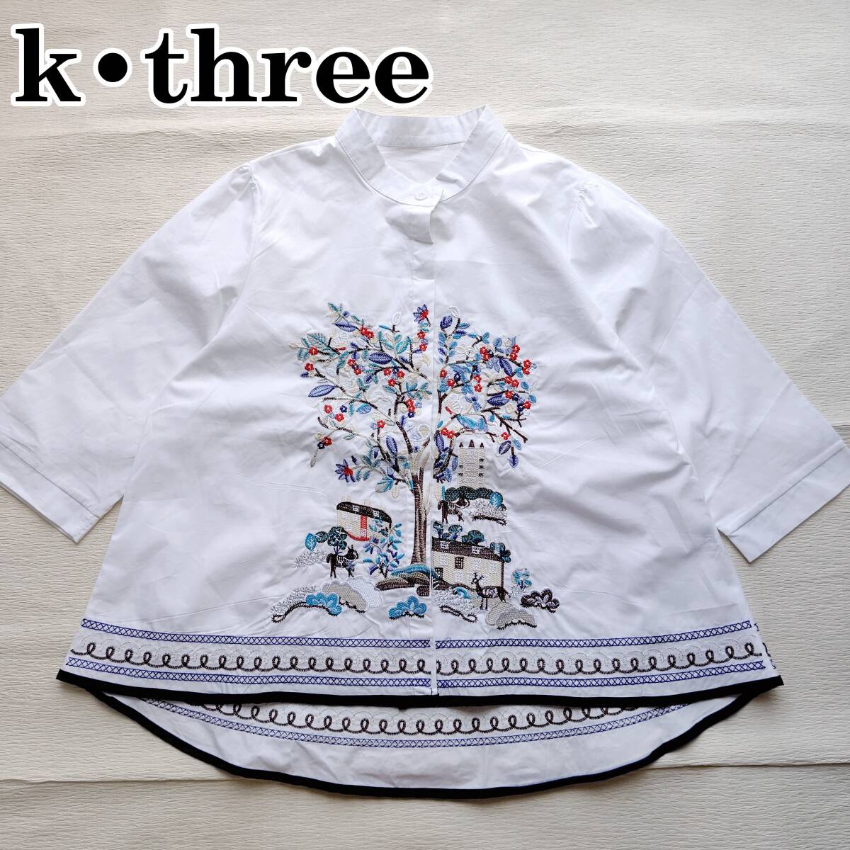 - k three ケイスリー レトロ刺繍 七分袖ブラウス バンドカラー ノーカラー レディース ゆったりM-L 250718-07