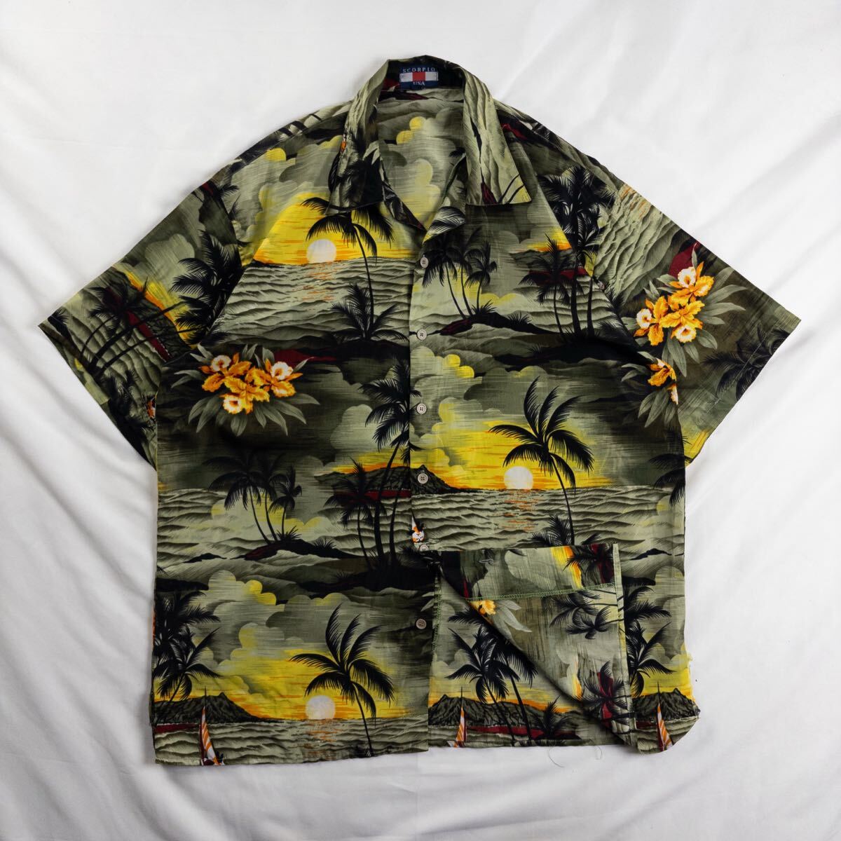 > US Vintage 00s SCORPIO USA ポリ 開襟 オープンカラー ビーチ パーム ヤシ アイランド ボタニカル ハワイアン アロハ 総柄シャツ