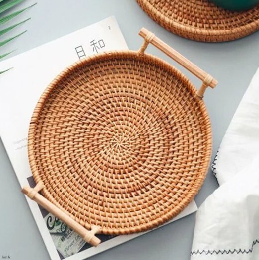 - 【新品未使用】円形 ラタン トレイ バリ インドネシア テーブルウェア 取っ手つき 丸形