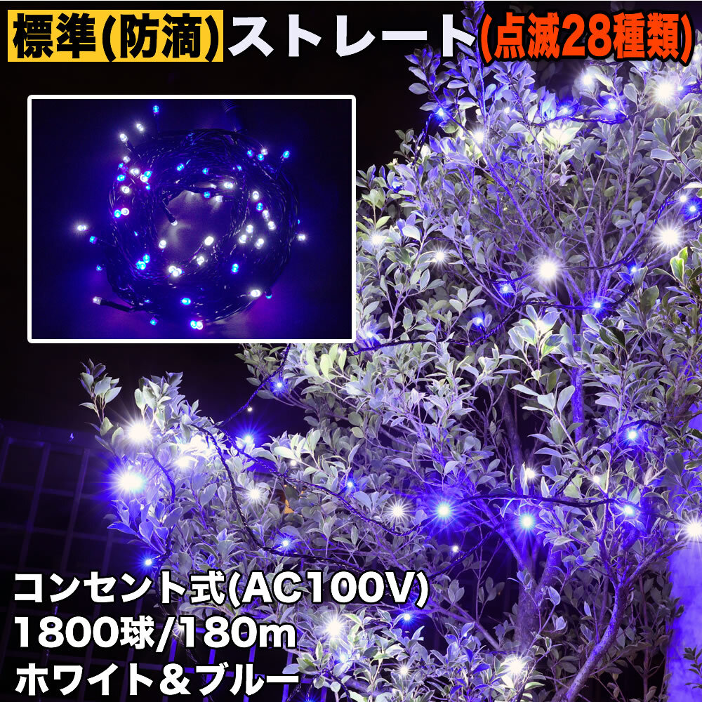 > クリスマス 防滴 イルミネーション ストレート ライト 電飾 LED 1800球 180m 2色 白 ・ ブルー 28種点滅 Bコントローラセット