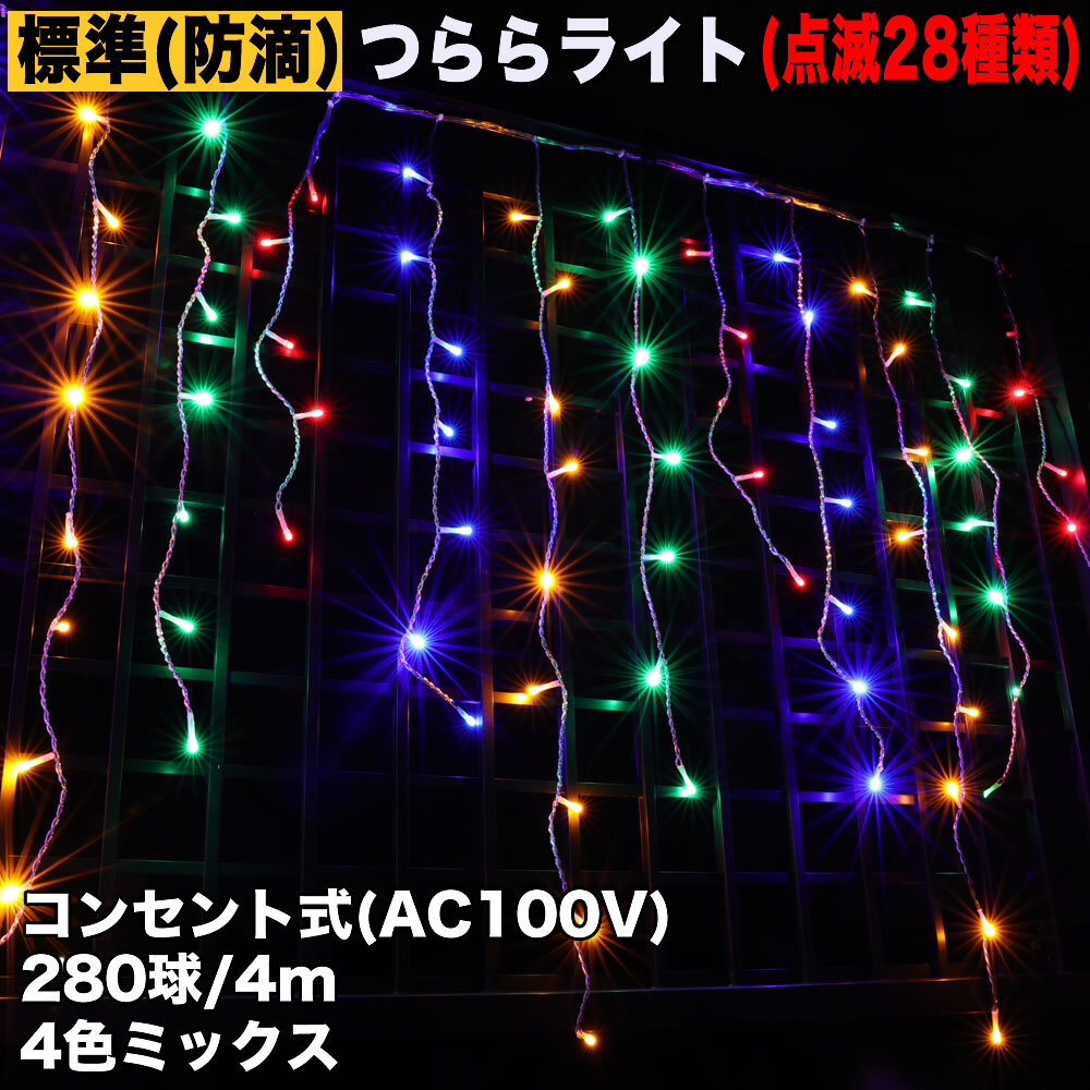 > クリスマス 防滴 イルミネーション つらら ライト 電飾 LED 4m 280球 4色 ミックス 28種点滅 Bコントローラセット