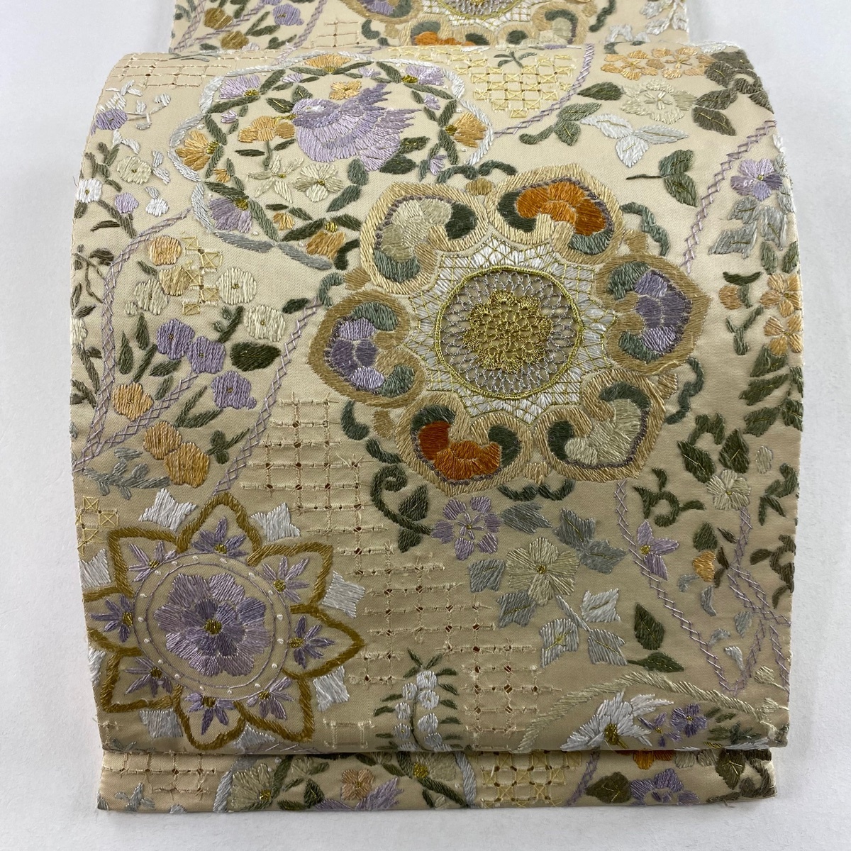 > 袋帯 逸品 華文 鳥 刺繍 金糸 ベージュ 六通 正絹 【中古】