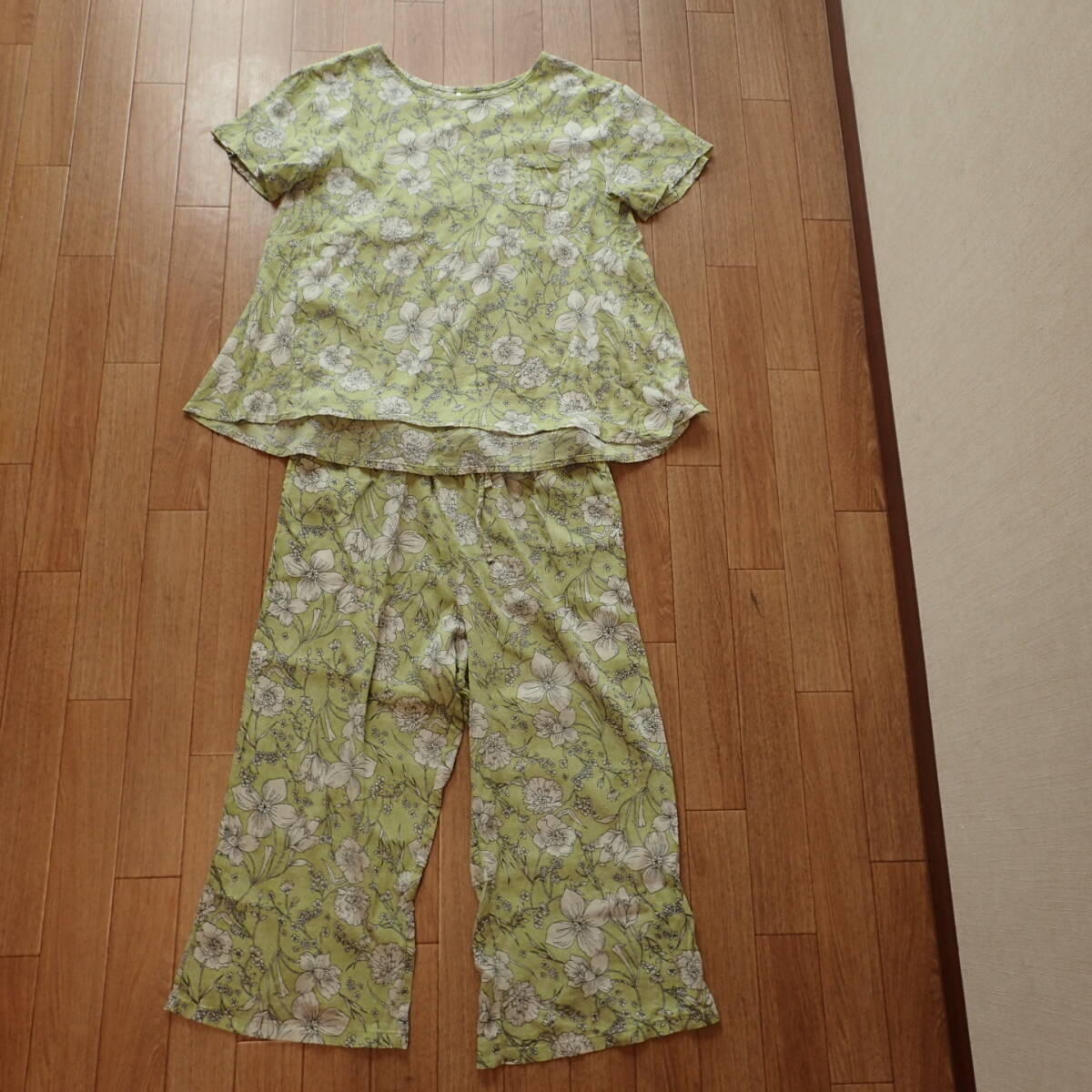 - @@ラスト1 美品 日本製 アズ ボタニカル柄 パジャマ 上下セット 花柄 半袖 パンツ 寝巻き ルームウエア 3L グリーン系 緑系 コットン