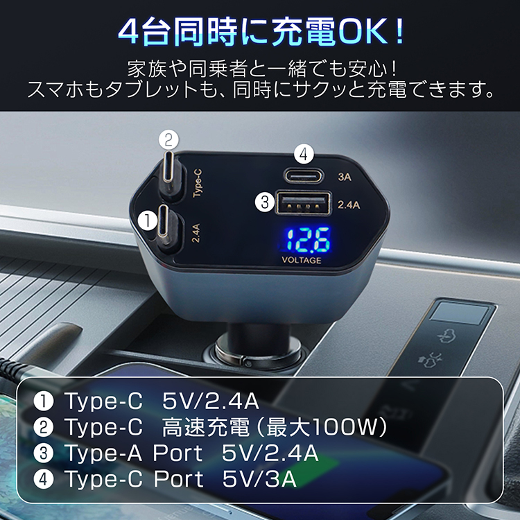 - 載充電器 カーチャージャー 充電器 車 車シガーソケット 車充電器 巻き取り 伸縮自在 リール式
