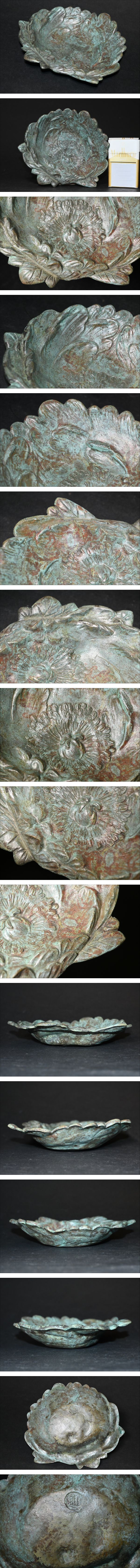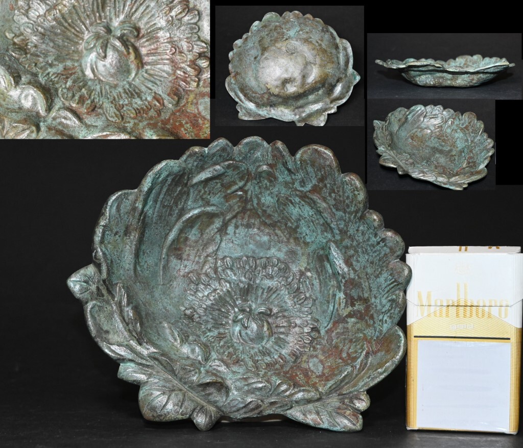 > ブロンズ 牡丹形 トレイ 小物入れ 飾皿 灰皿 灰器 時代 彫刻 在銘 箱無 詳細不明 アンティーク 花モチーフ 置物 オブジェ