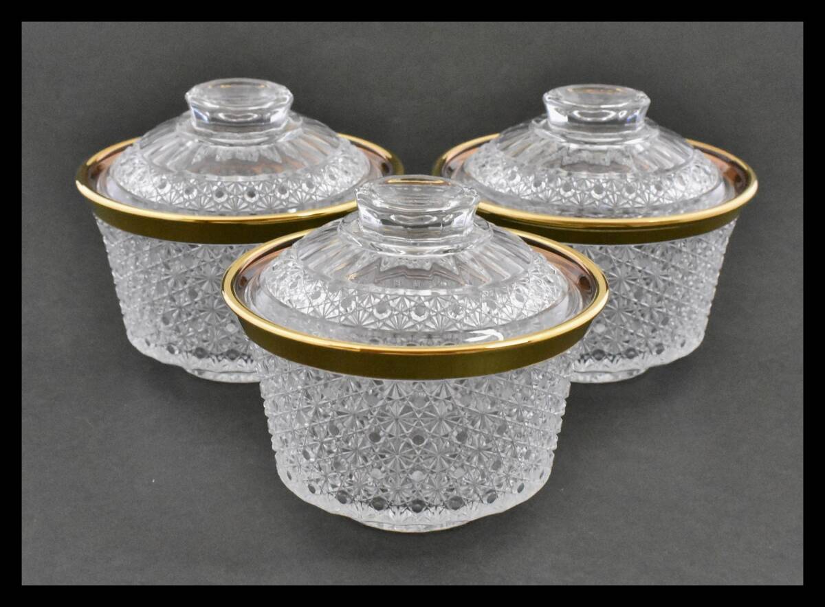 - ▲楠廸庵▲義山菊籠目縁金蓋物(3客入)長寿作 ガラス 茶道具