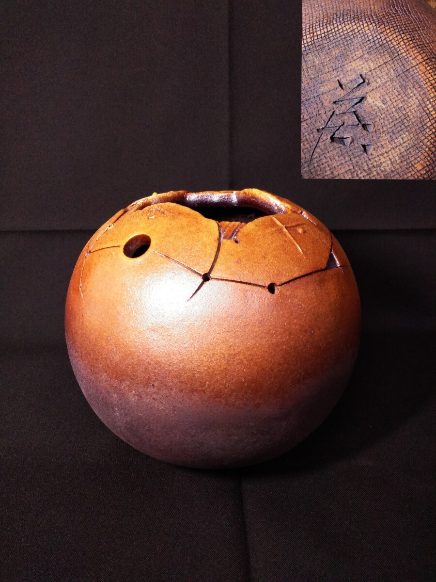 - 陶印 丸型 花瓶 花器 飾壷 陶器 置物 床飾り オブジェ (検索) 工芸 美術 球体 作家 在銘 アンティーク 古玩 華道 花生 花入 会席 懐石