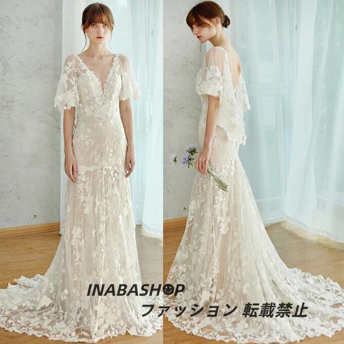 > ウエディングドレス ウェディングドレス マーメイドライン 袖付き マーメイドドレス 袖レース Vネック 結婚式 フィッシュテール 袖あり