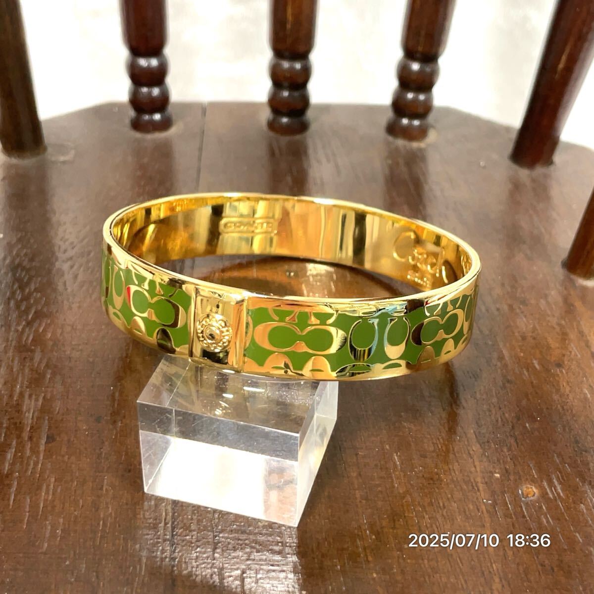 > 美品 COACH コーチ シグネチャー Cロゴ ゴールド × グリーンカラー バングル ブレスレット アクセサリー 装飾品 ファッション 小物