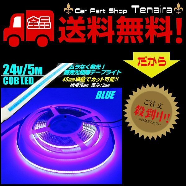 - 24v COB 面発光 LED テープライト 5m巻き 極薄2mm 青 ブルー 色ムラなし カット使用可能 ランプ アンドン メール便送料無料/5