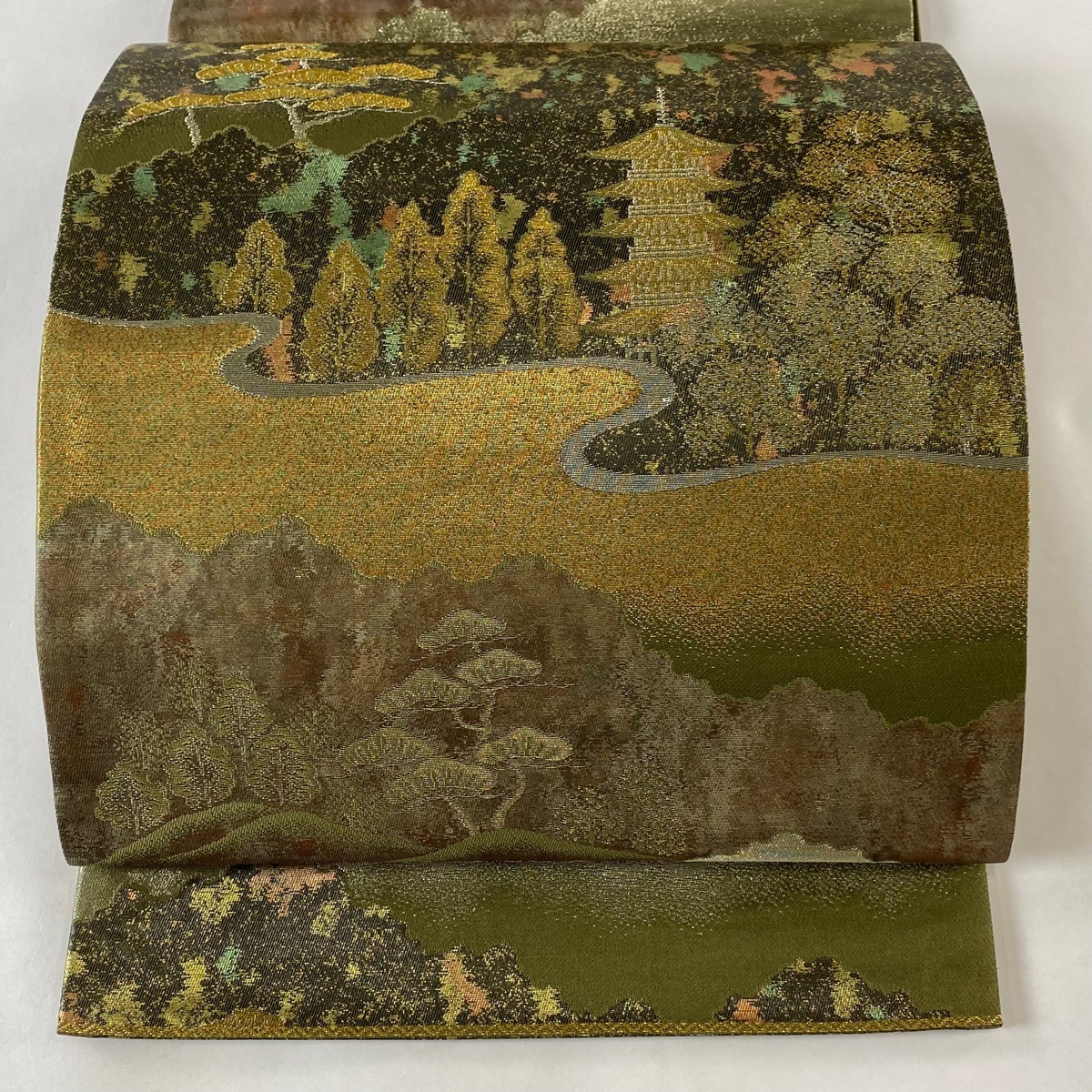 - 袋帯 美品 秀品 建物 樹木 箔 茶緑色 六通 正絹 【中古】