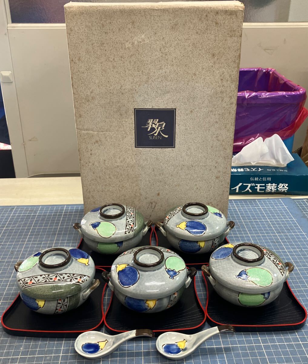 - 【蓋茶碗蒸し器 翠泉色 5客セット】陶器 和食器 蓋物 懐石料理 なすグルメセット 箱入り【A9-4】0815+-