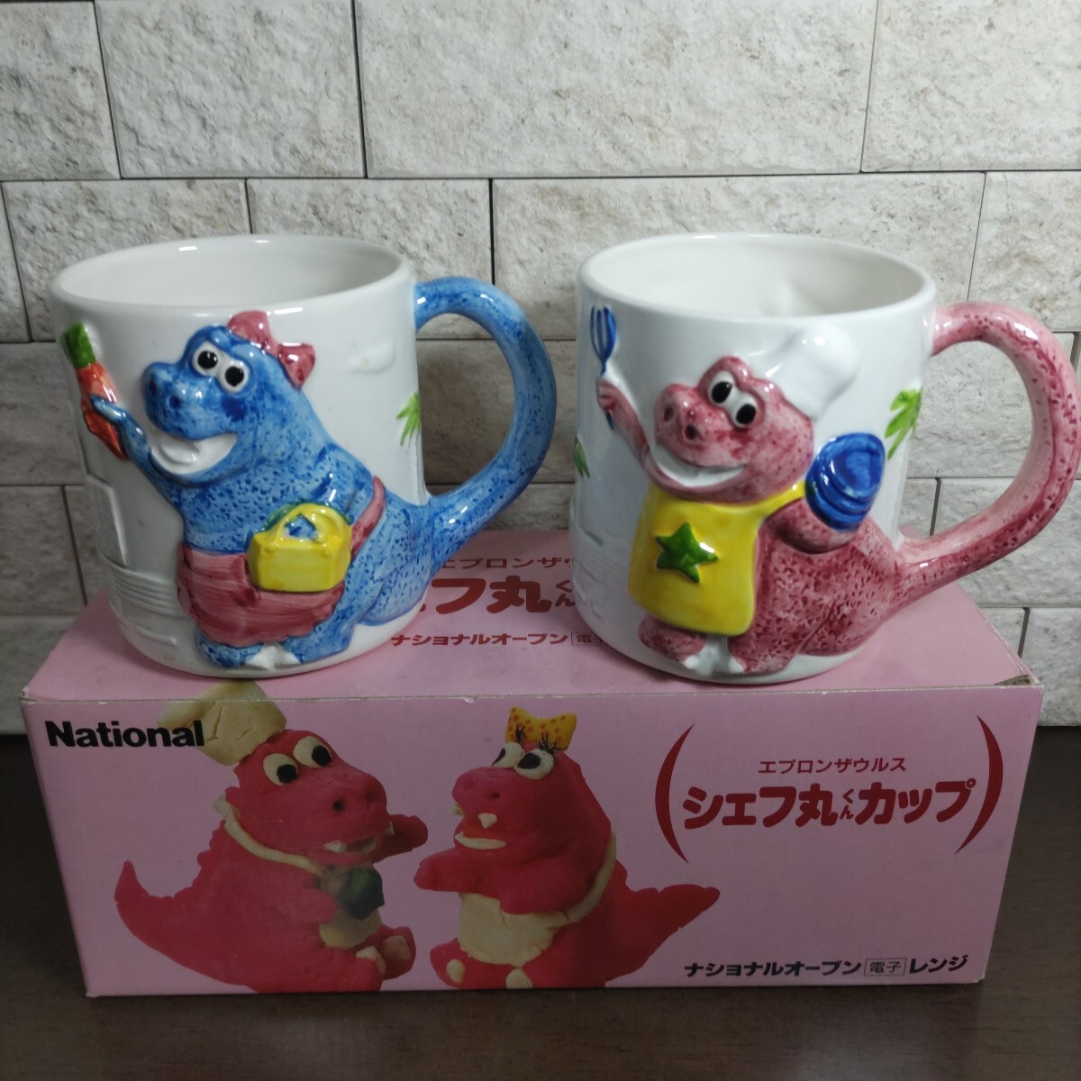 - 昭和レトロ National/ナショナル エプロンサウルス(恐竜デザイン)シェフ丸くんカップ 陶器製 オーブンレンジ購入記念 マグカップ