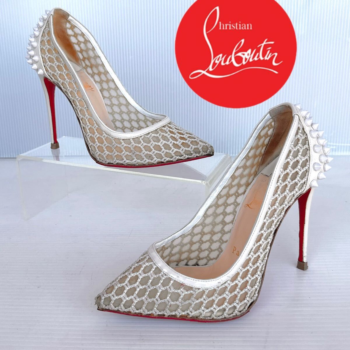 > Christian Louboutin クリスチャンルブタン スタッズ ハイヒール パンプス ポインテッドトゥ 白 35.5 メッシュ 靴 レーディス シューズ