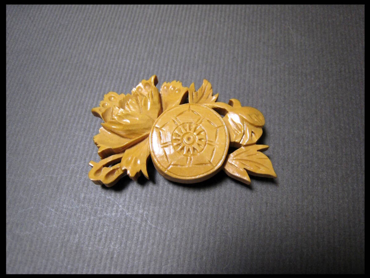 - 柘植製 牡丹 車輪 彫刻 少し大振り5.5cm 帯留 着物 帯飾り 木彫 和装小物