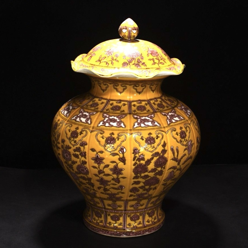 > 明時代 洪武年製 嬌黄釉釉に赤花卉紋 掻き稜蓮の葉蓋缶 陶磁器 中国美術 高さ58 cm 幅39 cm 骨董品 唐物 818