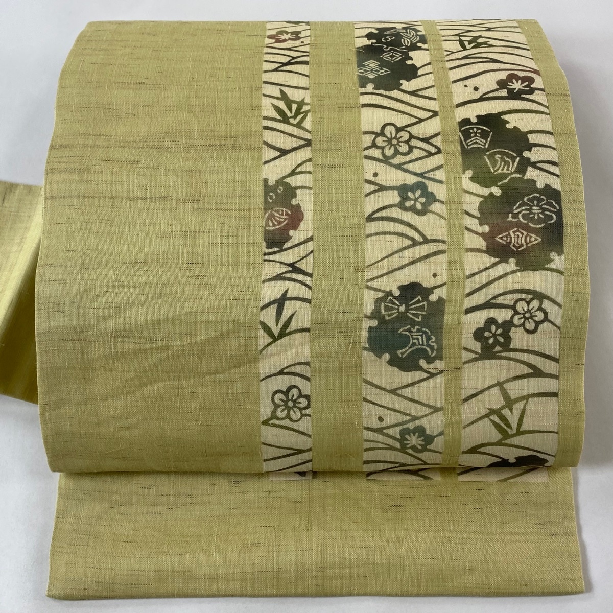 > 名古屋帯 美品 名品 紬地 雪輪 梅 抹茶色 正絹 【中古】
