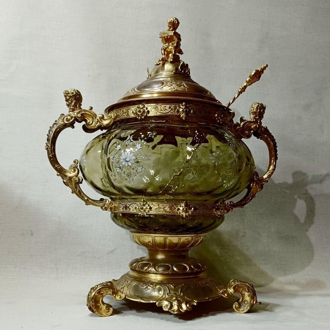 - 【年代物】西洋 アンティーク★特大 金彩 彫金 装飾 細工 ガラス スープジャー 金工 彫刻 ★ 年代物