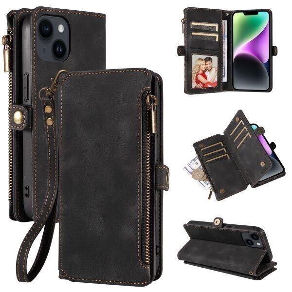 > iPhone14 【c6 黒 】手帳型 スマホカバー PUレザー スマホケース アイフォン 財布 小銭入れ ストラップ 落下防止 カード収納 無地 2