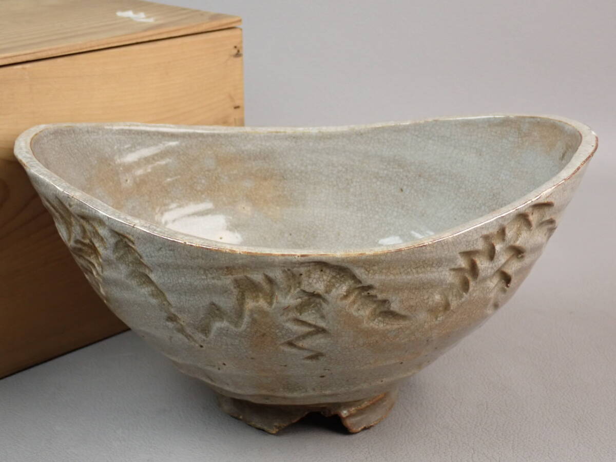 > 【骨董・茶道具】★古い 萩焼 古萩★★変形陰刻文大鉢 gn092xb 菓子器 盛鉢 和食器 花器 花道 華道