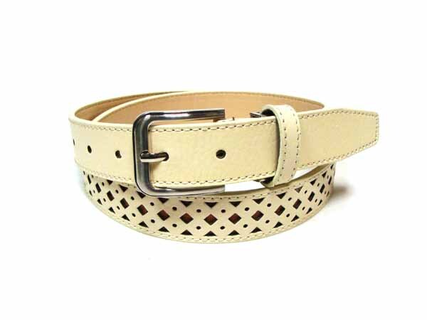 > 牛革使用 デザイン パンチング スリム レザー ベルト アイボリー #2 ピンバックル フリーサイズ 【 新品未使用 】 ◆ アウトレット ◆